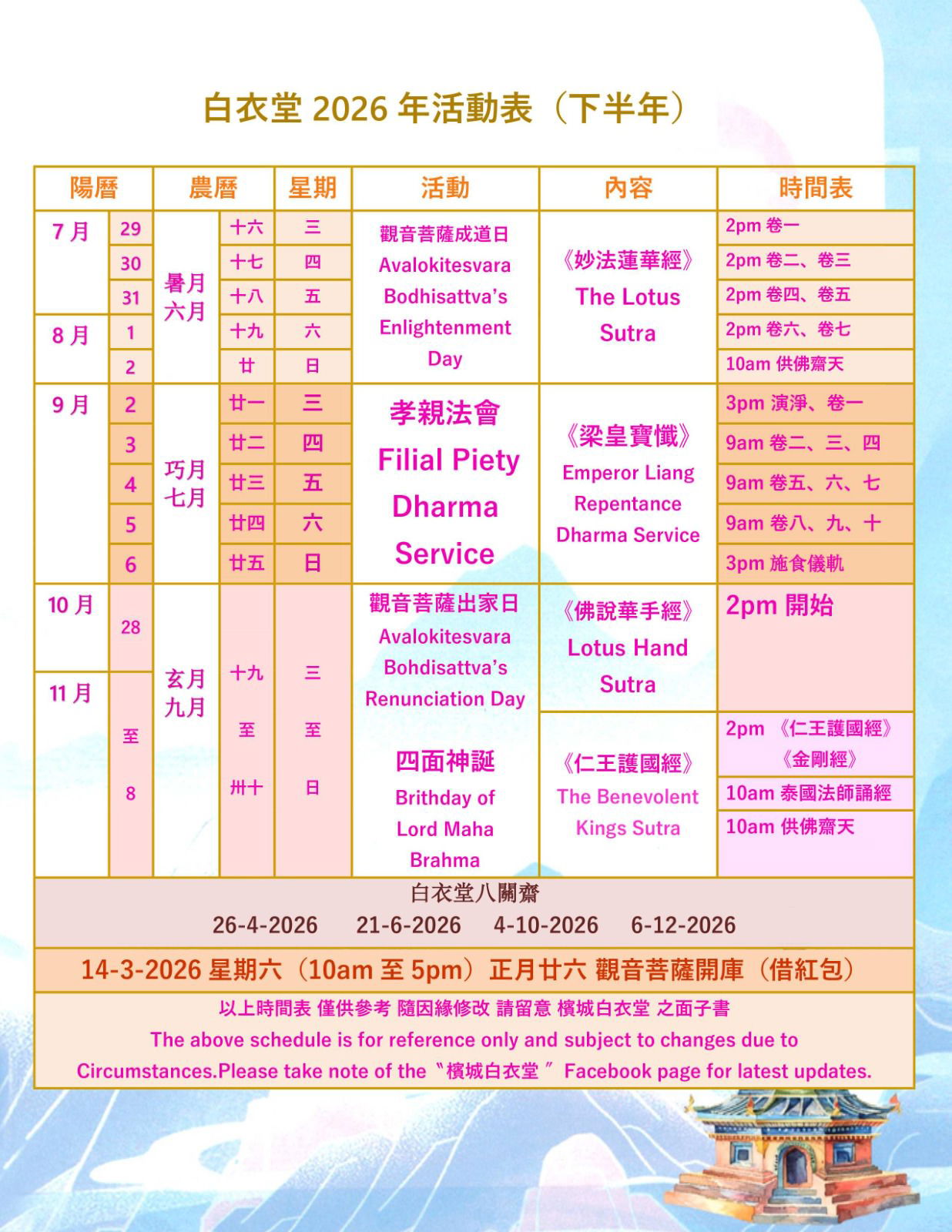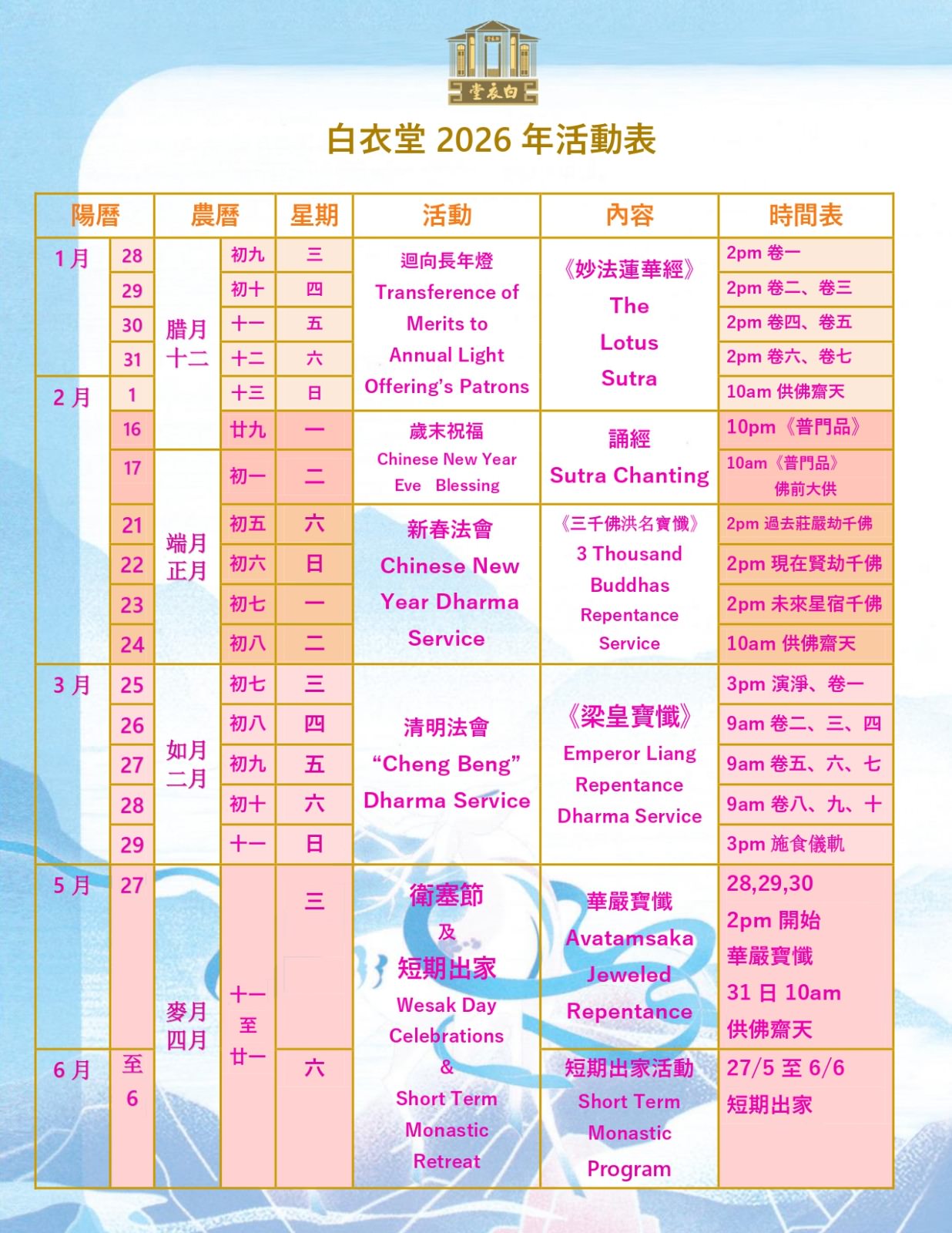 为您详细列出了白衣堂一整年的佛教活动安排,涵盖了佛诞庆典、观音诞、盂兰盆会、斋天等传统佛教节日,以及特别的法会和忏悔仪式。这些活动旨在弘扬佛法、加深信众的修行体验,并促进社区的精神共融。通过参与这些活动,信众们可以增进福慧,净化心灵。我们诚邀您届时参与,共同体验佛教的智慧与慈悲。